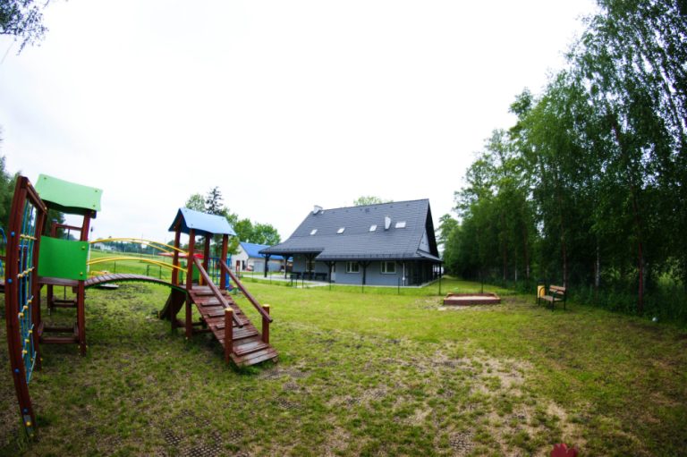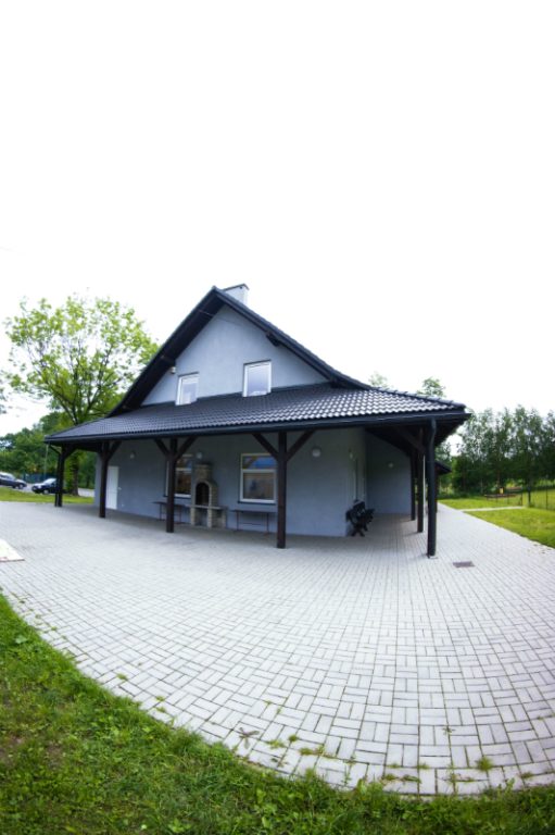 Budynek, wybudowany w 2012 roku, zachwyca tradycyjną konstrukcją przypominającą starą wiejską chatę. Nisko osadzone zadaszenie z trzech stron nadaje mu rustykalny charakter, a przestronny taras otwiera się na pięknie urządzony plac zabaw dla dzieci, zapewniając komfort najmłodszym uczestnikom wydarzeń.